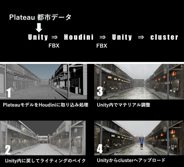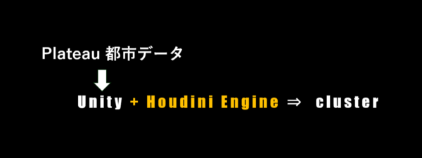 この課題を解決するため、Unity内でHoudiniの機能を利用できる「Houdini Engine」の活用を提案した。これにより、PLATEAUデータの取得から建築生成、Clusterへの書き出しまでを、Unity上でシームレスに完結させることが可能になるという。