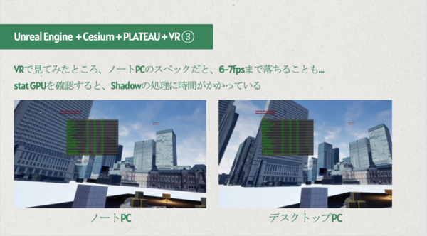 検証では、まず、データをリアルタイムでストリーミング描写する「Cesium for Unreal」で試行。Unreal EngineのVRテンプレートを使ってCesium経由で表示したPLATEAUをVRで視聴したところ、パフォーマンスが振るわず、低スペックのノートPCではフレームレートが6〜7fpsまで低下。高スペックのデスクトップPCでも快適とはいえない結果だった。GPU負荷はシャドウ周りの処理に集中していたという。