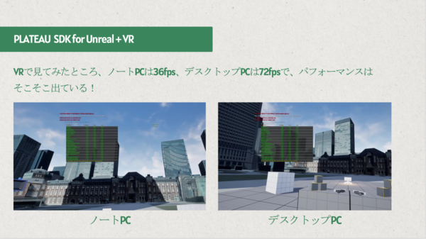 次に、3D都市モデルのデータを事前にインポートする「PLATEAU SDK for Unreal」を使って、VRでの視聴を検証した。こちらではパフォーマンスが劇的に改善され、両PCで快適な動作が確認できた。その一方で、約3km四方のデータをインポートするのに1時間以上を要するといった課題が浮かび上がった。