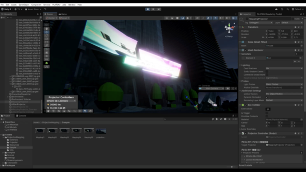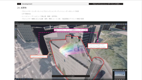 菰池氏が制作したシェーダーは、3D都市モデルの建物に映像を投影しながら、画角などをインタラクティブに調整できる。さらに、実際のプロジェクターの機種やルーメン数(光量)といった機材スペックを確認しながらシミュレーションできる実用性も備えており、より現実に即した企画検討を可能にする。