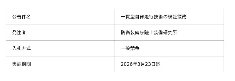 Turing株式会社(本社:東京都品川区、代表取締役:山本 一成、以下「チューリング」)は、防衛装備庁陸上装備研究所と「一貫型自律走行技術の検証」の役務請負契約を締結したことをお知らせします。当社は本契約のもと、乗用車向け自動運転の研究開発で培った成果を基盤に、未舗装路を含む不整地環境における一貫型自律走行技術(End-to-End、以下「E2E」)の性能を検証します。