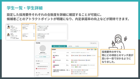 学生一覧のページにはマッチ度が一定以下の学生は表示されないようになっています。設定したそれぞれの採用要件に対する合致度と経歴のサマリーを一目で確認することができ、検索性が向上しました。