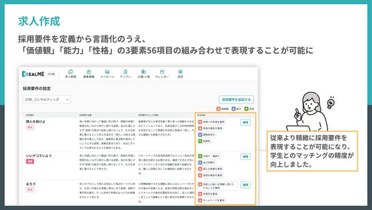 採用要件のラベリング項目が「価値観」「能力」「性格」の3つの要素、全56項目で表現できるようになったほか、個別の採用要件ごとに項目をラベリングすることができるようにもなりました。マッチ度を判定する項目が細分化されたことで、学生とのマッチングの精度が向上しました。