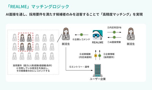 『REALME』はAI面接を通して定量化された学生の能力・価値観をもとに、自社の採用要件を満たす学生とマッチングできるサービスです。