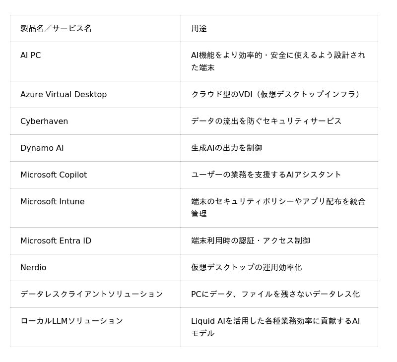 また、AI PCにデータを残さないデータレスクライアント化や仮想デスクトップ構成にすることも可能です。高度なAI処理に必要な作業の一部を端末に分散することでGPUサーバの電力消費を抑え、環境負荷の軽減にも貢献します。