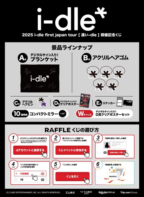 またドコモは、本ツアー開催記念として、2025年10月4日(土)から2025年10月31日(金)まで、オンラインくじ企画「『2025 i-dle first japan tour [ 逢い-dle ]』開催記念くじ」(以下オンラインくじ)を、「VT CUBE JAPAN 株式会社」と共同で開催いたします。オンラインくじは、本ツアー会場で配布されるチラシや専用ブースでご購入・抽選参加いただけるほか、ツアーに参加できなかったファンのみなさまもオンラインで購入が可能です。景品には、「i-dle」メンバーのデジタルサインが入ったブランケット・クリアポスターなど、多数のオリジナルグッズをご用意しています。