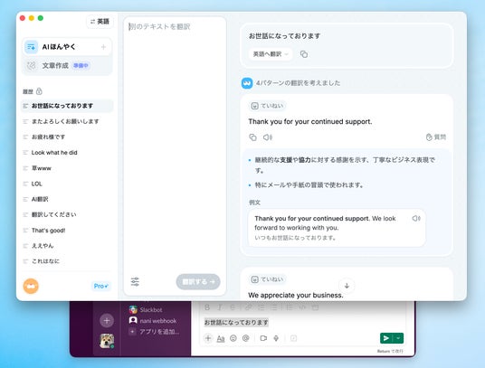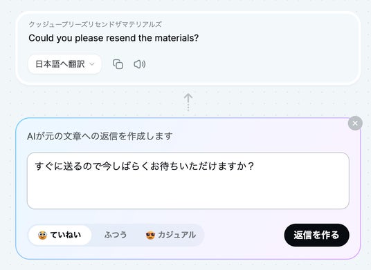 従来の“1入力=1訳”の翻訳ツールとは異なり、複数の言い回しの提案に加え、AIによりニュアンスや使い分けの解説までチェックすることができます。翻訳後には、原文と同じ言語でAIにより返信文を作成することもできます。