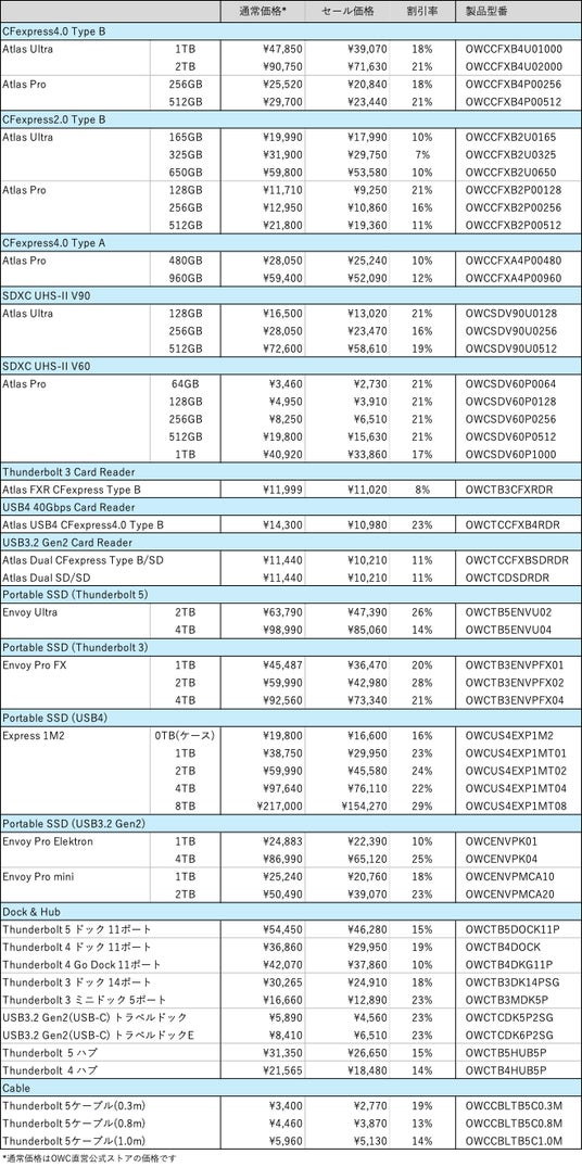 Other World Computing, Inc.(OWC(R)️: 米国イリノイ州ウッドストック)は、Amazon.co.jpで10月4日(土)0:00から10月6日(月)に開催されるプライム感謝祭先行セール、および10月7日(火)から10月10日(金)23:59に開催されるプライム感謝祭に参加します。期間中のセール対象製品ならびにセール価格の詳細は価格表を参照ください。