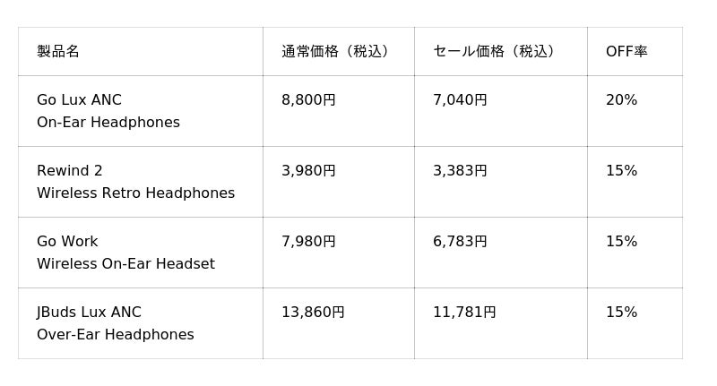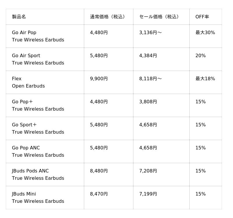 2024年度に100ドル以下のスポーツイヤホンと50ドル以下のワイヤレスイヤホンのカテゴリーで全米売上No.1(※1)を獲得した「JLab」の日本法人、JLab Japan株式会社(本社:東京都港区、代表取締役:横張 亮輔)は、2025年10月4日(土)0:00 ~ 2025年10月6日(月)23:59 まで開催される「Amazonプライム感謝祭先行セール」および、2025年10月7日(火)0:00 ~ 2025年10月10日(金)23:59 まで開催される「Amazonプライム感謝祭」において、人気のワイヤレスイヤホン・ヘッドホン等、19製品を最大30%OFFにて販売いたします。
