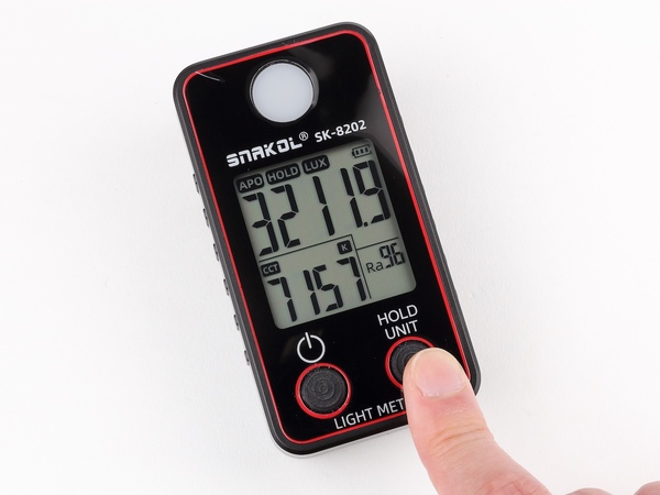 使い方は想像通りで、電源ボタンを押して動作させ、表示された数値を読むというものです。数値は上部が「照度」で単位はLux、左下が「色温度」で単位はK、右下が自然光が当たったときの色をどの程度再現しているかを示す「Ra値」となります。表示は約2秒に1回更新されるので、止めて読みたければホールドボタンを押しましょう。