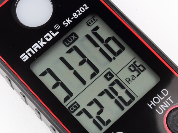 もっと安く測れるものはないか……と探して見つけたのが、「SK-8202」(Amazon価格1万779円)という照度計。基本は明るさを調べる照度計なのですが、なんと、Raと色温度も数値で表示してくれるのです!