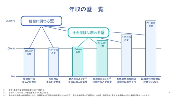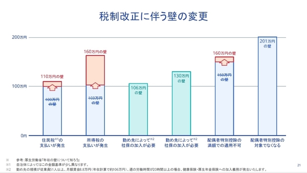ただし、社会保険への加入が必要となる「壁」には変更がない点には注意が必要だ。「今回の改正によって、年収が増えていくと、所得税の壁より先に『社会保険の壁(130万円)』にぶつかることになる」と辻氏は説明する。