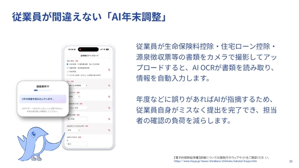 目玉となる新機能が「AI年末調整」だ。従業員が生命保険料控除や住宅ローン控除、源泉徴収票などの書類を撮影・アップロードすると、AI-OCRが書類を読み取り、情報を自動入力する。AIが誤りも指摘してくれて、従業員の手間だけではなく、労務担当者の確認作業も減らせる機能である。