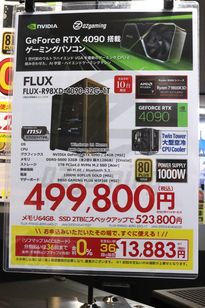 そのほか、ソフマップ なんば店では現在、GeForce RTX 4090を搭載したOZgamingのゲーミングPCを受注中です。台数はソフマップ全店舗あわせて10台限定。前世代最強GPUとして高く評価されるRTX 4090に加え、CPUにはゲーミング性能で定評のあるRyzen 7 9800X3Dを搭載しています。
