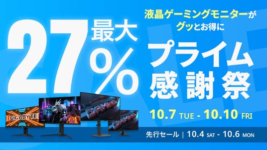 10月4日(土)から開催される「プライム感謝祭先行セール」において、GIGABYTEの人気製品が最大27%OFFとなる特別セールを実施します。