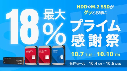 10月4日(土)から開催される「プライム感謝祭先行セール」において、SandiskとWesternDigitalの人気製品が最大18%OFFとなる特別セールを実施します。