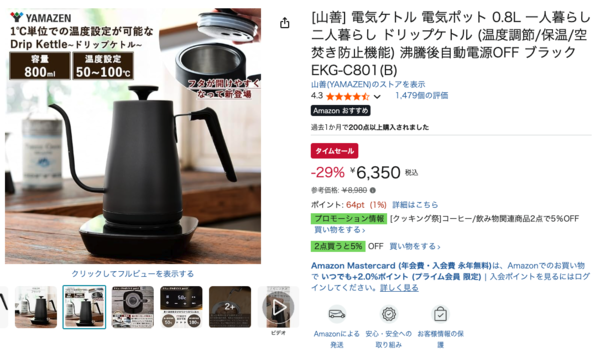 山善から電気ケトル「EKG-C801(B)」が、通常価格8,980円から29%オフの6,350円でAmazonに登場。Amazonでは10月4日よりAmazonプライム会員限定のセール「プライム感謝祭先行セール」を実施中ですが、この製品の値下げは通常の「タイムセール」として実施中。そのため、プライム会員でなくてもお得に購入可能。