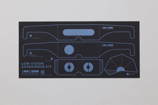 ロービジョンの見え方を疑似体験するメガネで、見えない世界を歩くためのキットです。一括りに「見えない」と言っても、視覚情報がまったく得られない全盲だけではありません。ロービジョンの見えなさ・見え方は人によってさまざま。キットではコントラスト低下、視野狭窄、中心暗点の3つの見え方で、見えない世界を疑似体験できます。