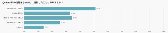 さらに「投資やキャリアを考え直した」と答えた人も25.6%存在し、Redditが職業選択や資産形成といった重要な意思決定にも影響を与えていることが確認されました。