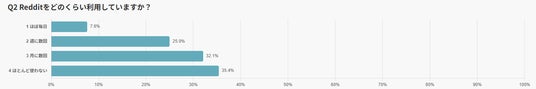 さらに、Redditを知っていると回答した212人に対して、実際の利用頻度を尋ねたところ、「ほぼ毎日利用している」と答えた人は7.6%にとどまりました。