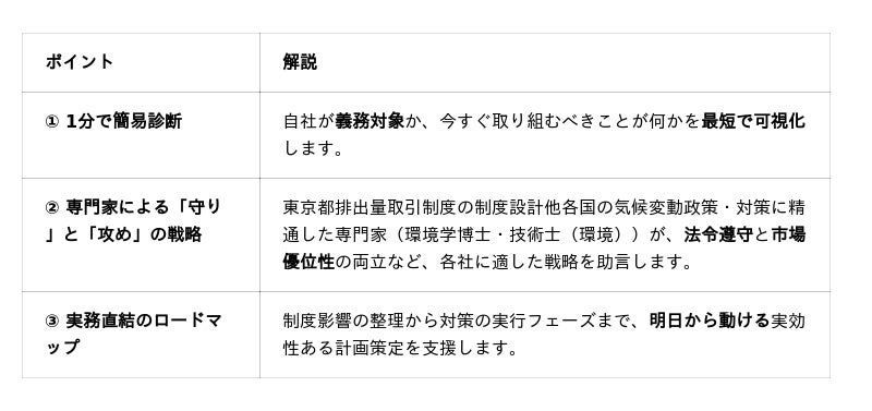 本サービスは、従来の「高額コンサル依存」や「情報不足」による「脱炭素疲れ」を解消し、気候変動政策・対策に精通した専門家の知見に基づいた、市場競争で優位に立つための「守り」と「攻め」の戦略を提供します。
