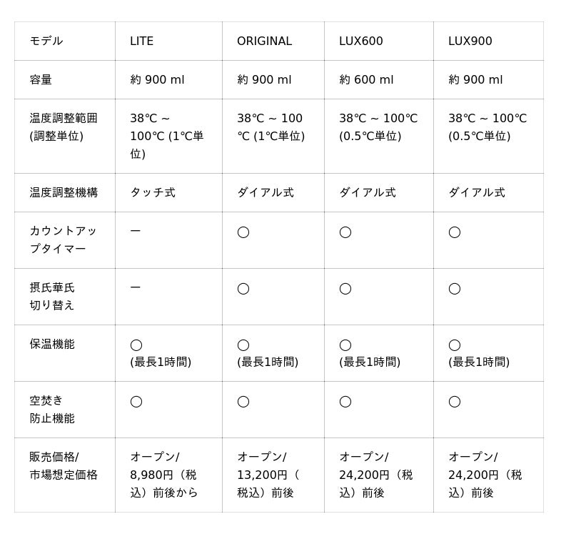 ■ケトルシリーズ モデル別スペック比較