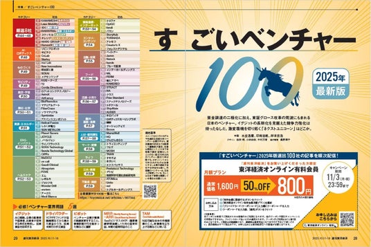 週刊東洋経済が発表する「すごいベンチャー100」は、ユニークなビジネスモデルや先進的な技術を持つベンチャーの中から、未来のユニコーン企業への成長が期待される「ベンチャー企業100社」を、週刊東洋経済が資金調達額の大きさや事業・技術の独自性などを基準として、厳選し紹介する恒例特集です。