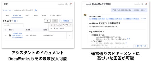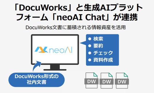 生成AI技術に特化したソリューションを提供する株式会社neoAI(本社:東京都千代田区、代表取締役社長・CEO:千葉 駿介)は、富士フイルムビジネスイノベーション株式会社(本社:東京都港区、代表取締役社長・CEO:浜 直樹)との技術提携による第一弾として、neoAIが提供する企業向け生成AIプラットフォーム「neoAI Chat」と、富士フイルムビジネスイノベーションのドキュメントハンドリング・ソフトウェア「DocuWorks」との連携を2025年10月8日より開始します。本連携により、「DocuWorks」で作成したファイルを「neoAI Chat」にアップロードし、「DocuWorks」ファイル内の情報を生成AIで読み取ることが可能になります。これにより、社内に蓄積された「DocuWorks」ファイル内のデータをもとにした情報探索やデータの利活用が図れます。