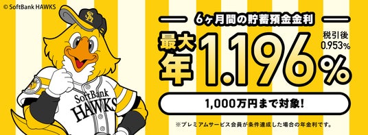 金利上乗せ適用期間中、2025年シーズンの福岡ソフトバンクホークスの最終勝率(0.626)にちなんで年0.626%(税引前)を貯蓄預金金利に上乗せします。