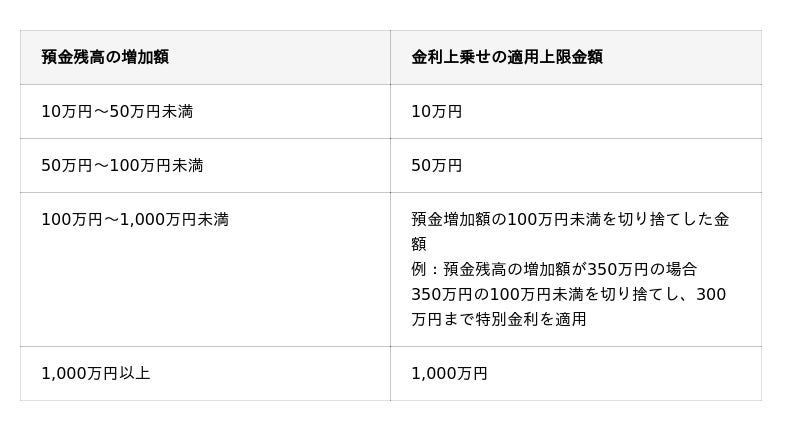 2025年10月6日~2025年11月5日の期間中の預金残高(普通預金と貯蓄預金の合計)の増加額(最大1,000万円)に応じて金利上乗せの適用上限金額が変わります。