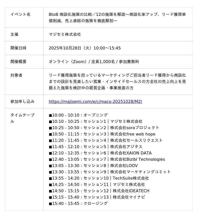TechSuite株式会社(テックスイート/代表取締役: 畠山夏輝)は、2025年10月28日(火)にマジセミ株式会社が主催するオンラインカンファレンス「BtoB 商談化施策の比較/12の施策を解説~商談化率アップ、リード獲得単価削減、売上直結の施策を徹底解剖~」に登壇します。