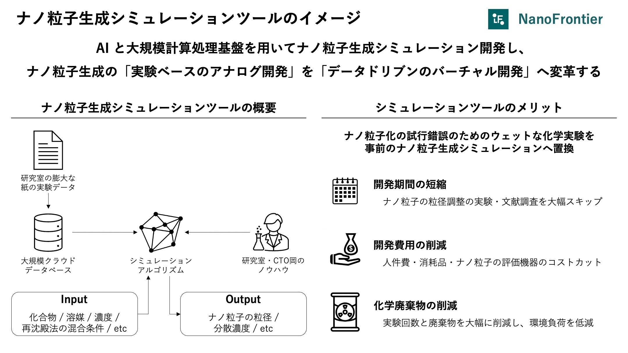 NanoFrontierは、有機材料をナノ粒子化して分散性や表面積を高め、感度や機能性を引き上げるコア技術を強みとしています。今回の採択を機に、ナノ粒子生成プロセスの設計空間をAIで探索し、粒径や分散状態などの条件最適化を高精度に予測するシミュレーション基盤を構築します。これにより、環境センシングやエネルギー、熱マネジメント、医療分野などで求められる高機能材料の創出を、限られた人だけが扱える高価で複雑な技術に依存せず、誰もがアクセスできる形で提供することを目指します。