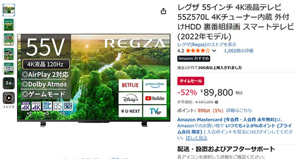 REGZA(レグザ)の55インチ 4K液晶テレビ(2022年モデル)「55Z570L」がAmazonタイムセールに登場。