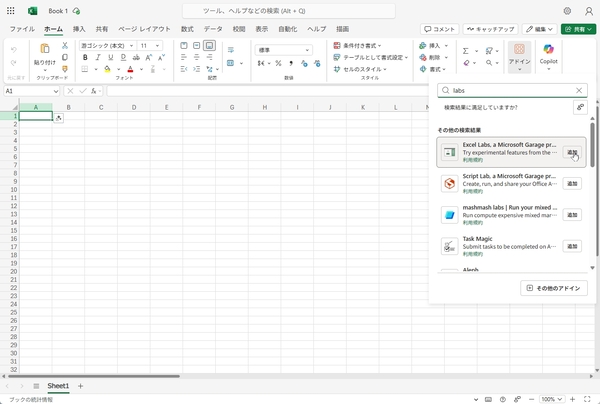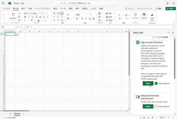 まずは、ウェブ版のExcelを開き、「アドイン」から「Excel Labs」をインストールする。「Excel Labs」を開いたら、「Agent Mode」の「Open」をクリックすればいい。「Make default」にチェックを入れておくとExcel Labsを開いた時に、自動でAgent Modeが表示されるようになる。