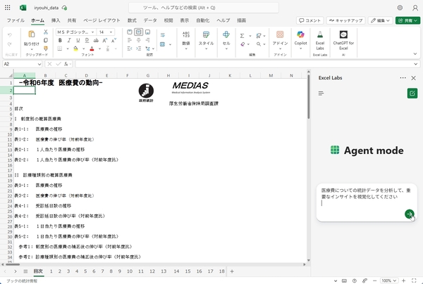 しかし、Agent Modeは粘り強い。このシートには27枚ものタブがあり、大量のデータが入っているのだが、値を上げずに分析を続けている。数分後、「ダッシュボード」というタブが追加され、医療費トップ10や総額の推移などのグラフが作成されていた。文字化けもしていない。
