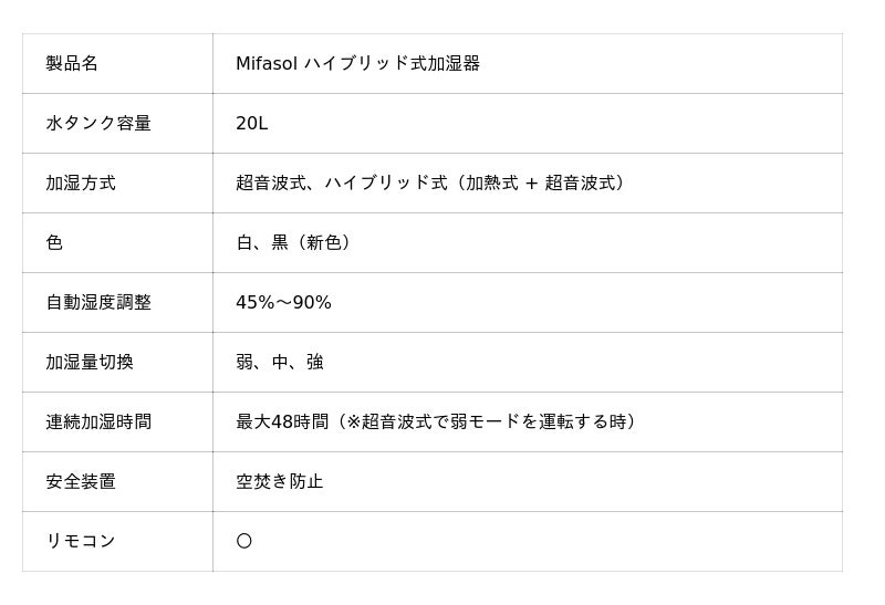 業界最大級の20L超大容量と、加熱式と超音波式を組み合わせたハイブリッド機能を搭載したMifasol(ミファソル)ハイブリッド式加湿器で乾燥知らず秋冬を過ごしましょう。