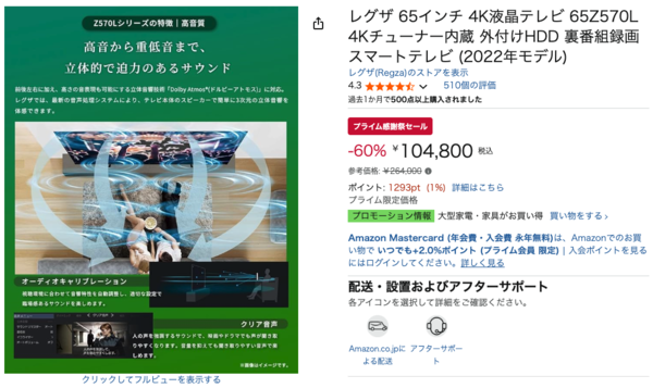 レグザの高性能モデル「レグザ 65インチ 4K液晶テレビ 65Z570L」が、プライム感謝祭セールで通常価格264,000円から104,800円へ大幅値下げ。