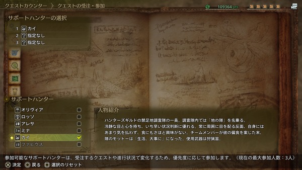 ただ、狩猟中は顔を見る機会がなく、ストーリーにも絡まないので「カイって誰?」という人も多いだろう。サポハン追加は第3弾からだが、拠点にはリリース当初からいたらしい。会えるかどうかはランダムで、どこかに座っていることが多い印象だ。