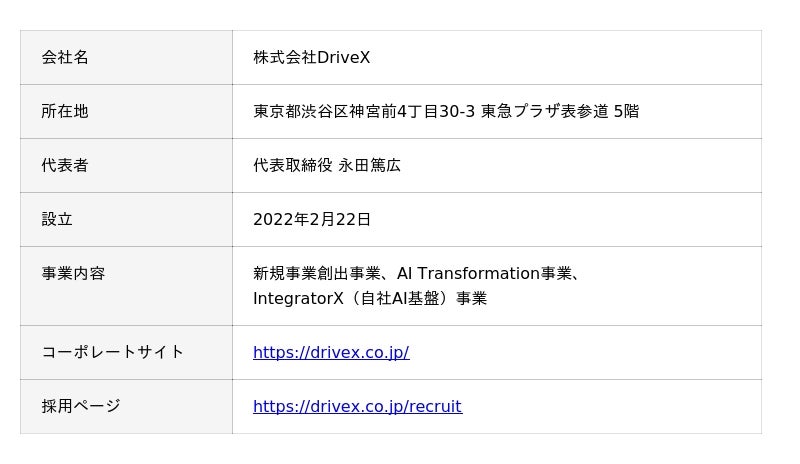 株式会社DriveX(ドライブエックス)は、「AI×事業創造力であらゆる事業をドライブさせる」をミッションに掲げ、企業のAI Transformationや新規事業創出を支援する会社です。
