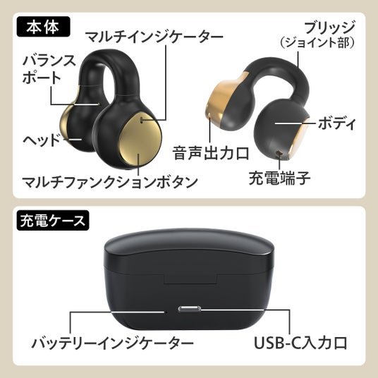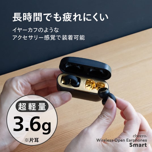 耳の穴をふさがず、清潔で快適な装着感!音楽を聴きながら周囲の音も聞こえるオープンイヤーワイヤレスイヤホン。超軽量イヤホンはイヤーカフのようなアクセサリー感覚で装着が可能です。