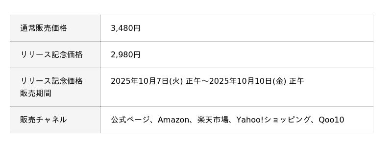 発売を記念して、10月10日(金)正午までの期間限定で、通常販売価格3,480円のところ、リリース記念価格2,980円にて販売いたします。