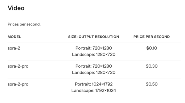 料金は、通常のSora 2が、720x1280(縦)または1280x720(横)の動画を、1秒あたり0.10ドルで生成可能。一方、上位版のSora 2 Proは、同じ解像度で1秒0.30ドル、さらに高解像度の1024x1792(縦)または1792x1024(横)では1秒0.50ドルだ。