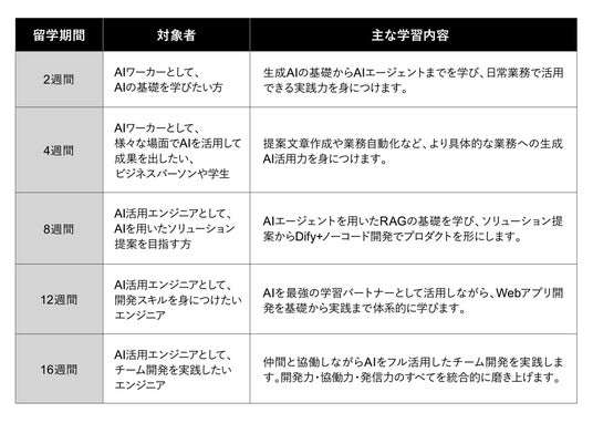 デジタル留学は、個人の目的とスキルレベルに応じて、AI活用の基礎学習を目的とした2週間コースから、AIをフル活用しチーム開発を実践するエンジニア向けの16週間コースまで、5つの留学期間で構成されています。これにより、ライトにAIの基礎を学びたい方から、専門的なAI開発スキルを目指すエンジニアの方まで、「すべての人」のレベルと目的に応じて、AI時代をリードするスキル習得をサポートします。