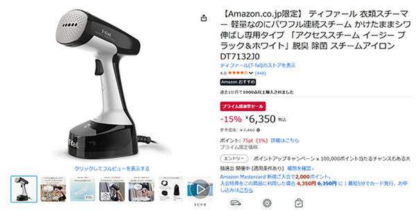 通常価格は7,480円のところ、今なら15%OFFの6,350円で購入できます。過去1か月で1,000点以上も売れたプロのスタイリストも愛用する衣類スチーマーを15%オフで購入できる機会をお見逃しなく!