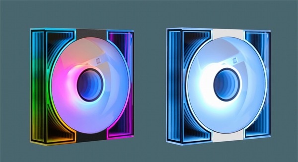筐体の前面と側面2方向がインフィニティミラーのように発光する120mmファン×3個モデル。回転数は800~1600回転で、最大風量は56.0CFM。設置位置で吸気/排気を選択できるよう、順回転と逆回転モデルを用意。逆回転モデルは非発光面(裏側)から吸気します。
