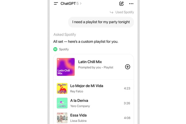 たとえば「Spotify、金曜のパーティー用プレイリストを作って」とチャットで指示すれば、ChatGPTがユーザーのSpotifyアカウントにアクセスしてパーソナライズされた選曲を提案する。チャット上で再生も可能だ。