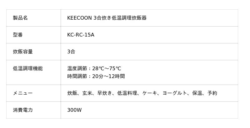 【調理家電を一つに集約】ひとり暮らしに最適!KEECOON3合炊き低温調理機能付きマイコン式炊飯器(KC-RC-15A)本格的なローストビーフからご飯までこれ一台