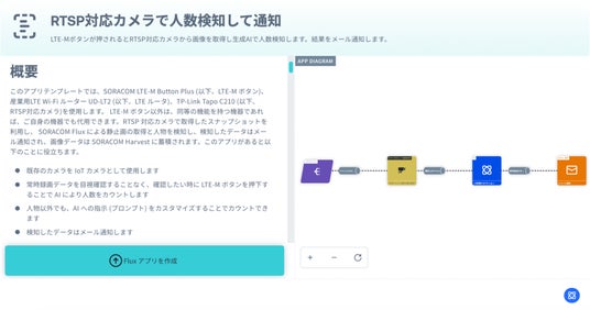 「RTSP対応カメラで人数検知して通知」のテンプレートは、RTSP(Real Time Streaming Protocol)対応カメラで静止画を取得し、SORACOM Fluxによる人物や指定した物体の検知を行うシステムです。実際の映像を保存することなく、ボタンデバイスを押したタイミングで画像を分析し、結果をメールで通知します。