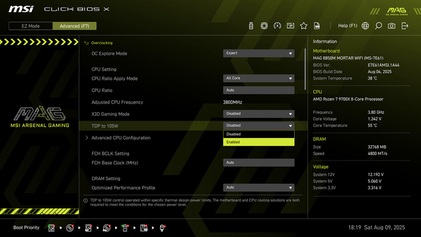 ここでは、Ryzen 7 9700Xの性能をより引き出せる「TDP to 105W」モードを使った