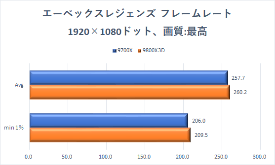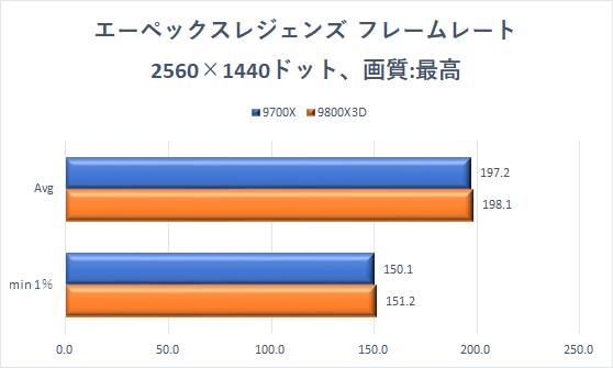 「レインボーシックス シージ エックス」も、9800X3Dと9700Xのフレームレートに、ブレの範疇となる違いしか見られなかった。「エーペックスレジェンズ」、「レインボーシックス シージ エックス」をメインにプレイするなら、Radeon RX 9060 XTと9700Xの組み合わせでもWQHD解像度でリフレッシュレート144Hzの張り付きプレイを狙っていける。さらに画質を2段下げた「高」をベースに調節することで、フルHD@360Hzや、WQHD@280Hzプレイを視野に入れられそうだった